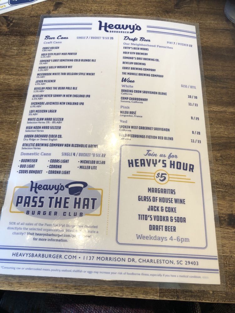 Heavy’s Barburger is a vibrant burger spot located in Charleston, SC, offering a variety of options for burger enthusiasts. The menu includes mouthwatering shareable snacks like crispy wings and flavorful salads.The highlight of the menu is the signature Barburger, featuring double patty, American cheese, and Heavys sauce. Customers rave about the delicious food and great service, making it a must-try spot for lunch or dinner. With a full bar, outdoor seating, and a welcoming atmosphere, Heavy’s Barburger is the perfect place to enjoy a tasty meal with friends and family. Don't miss out on their fantastic burger and fries, paired with local beers and refreshing cocktails. This burger joint stands out for its top-notch food quality, attentive staff, and cozy ambiance.